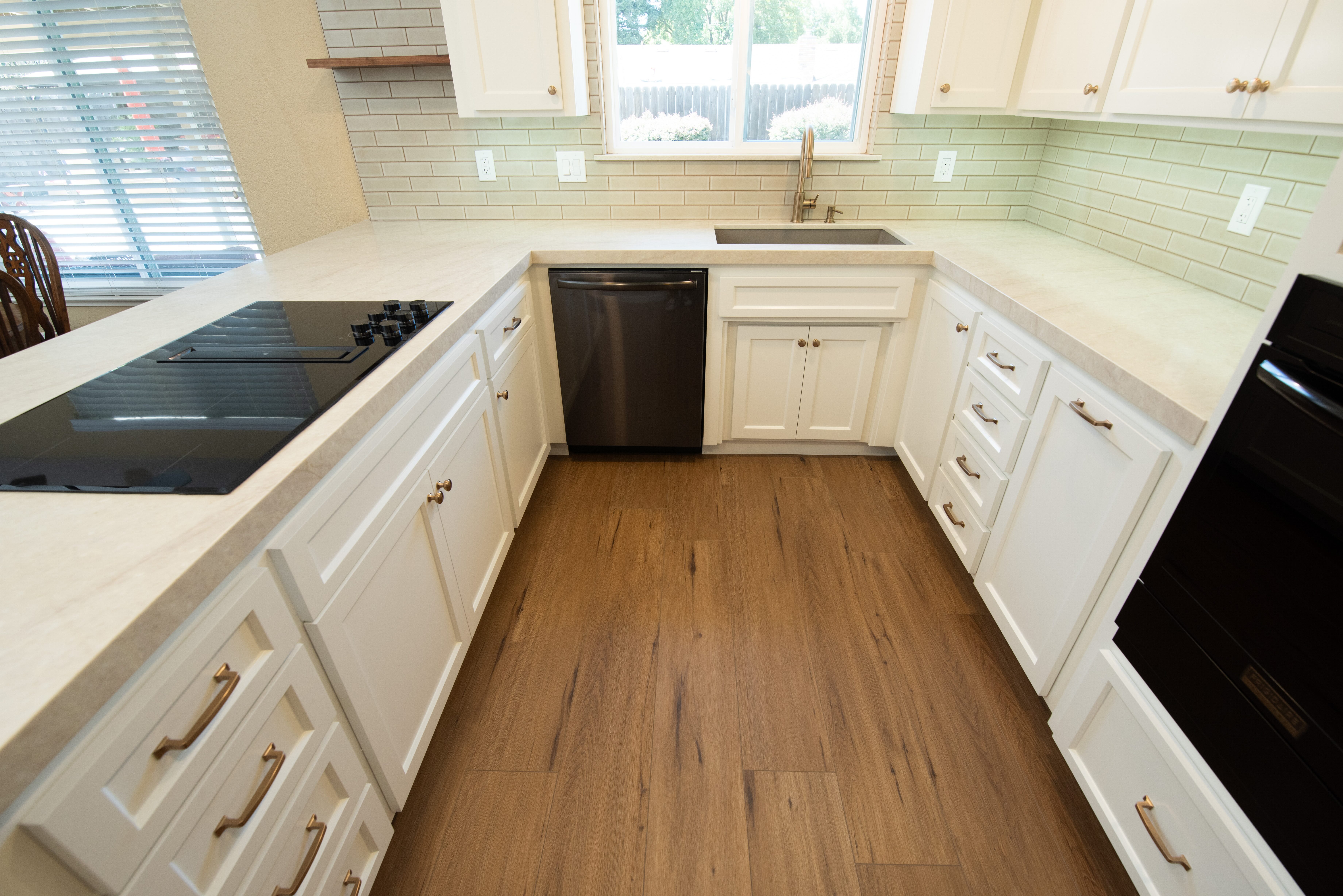 A custom tile backsplash and luxury vinyl plank flooring grounded the remodel in timeless textures.