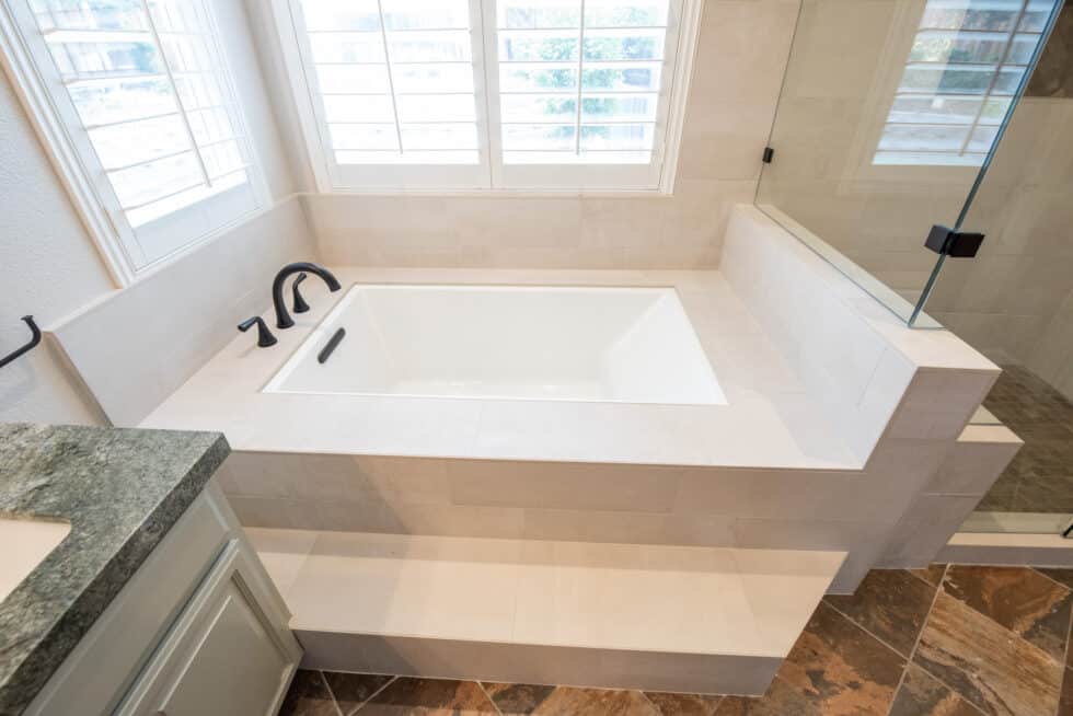 The homeowners chose to go with the Kohler Underscore 60″ Undermount Acrylic Tub in White to match the sinks and provide a pop of brightness in the bathroom. This spacious and luxurious tub uses acrylic for a lighter weight yet more durable finish.