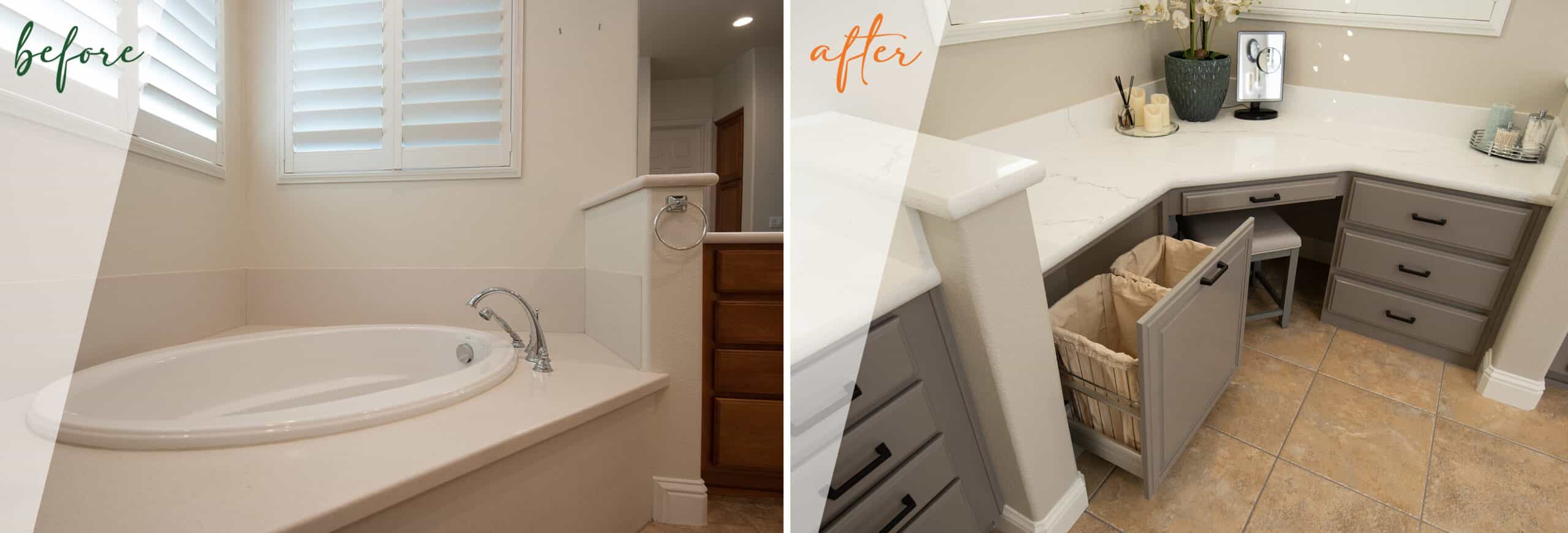 There are so many things to love about this bathroom transformation! Limited counter space was a major pain point in this bathroom for the homeowners, so to remedy this we created a beautiful extra-long vanity paired with quartz countertops and matte black cabinet pulls and faucets. Other features include the walk-in shower with stunning ceramic tile surround, a matching backsplash at the vanity, and the custom makeup corner!