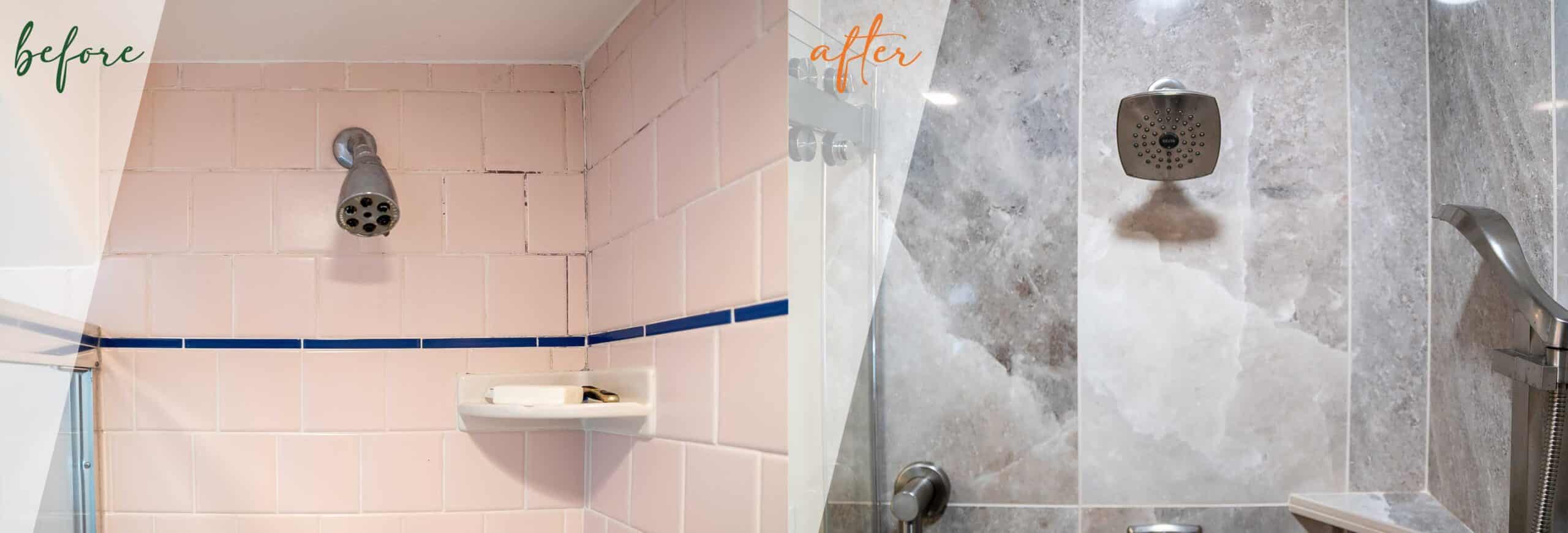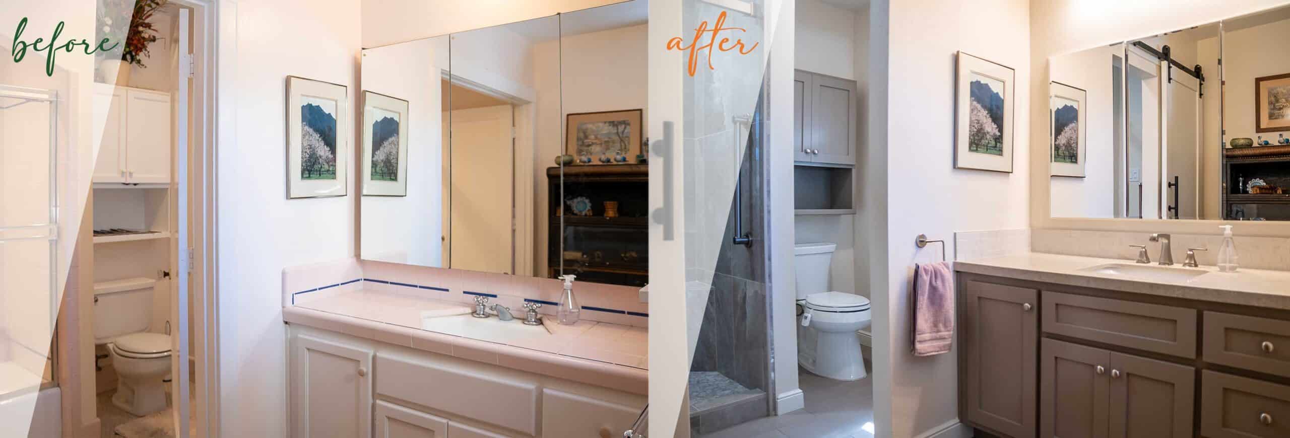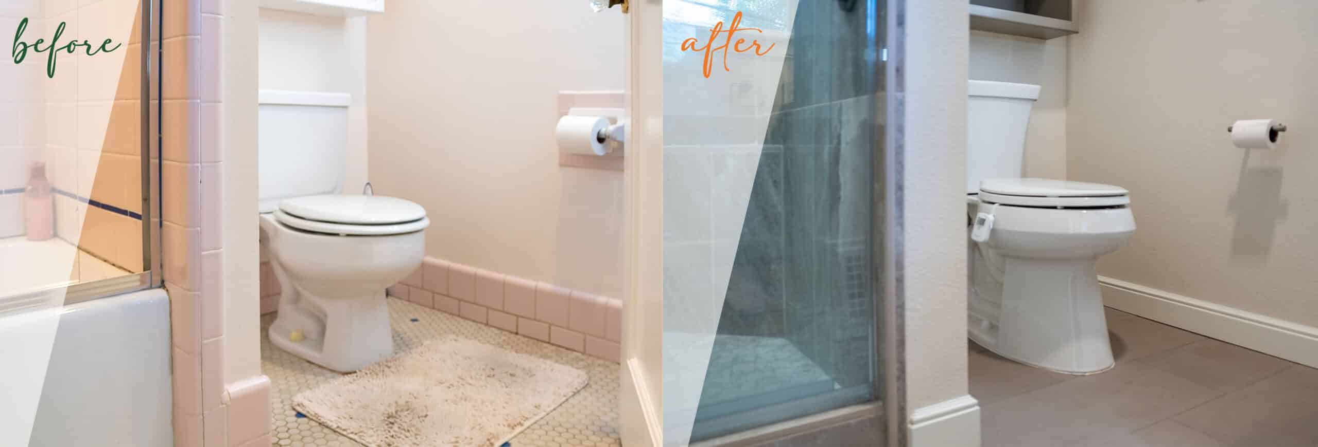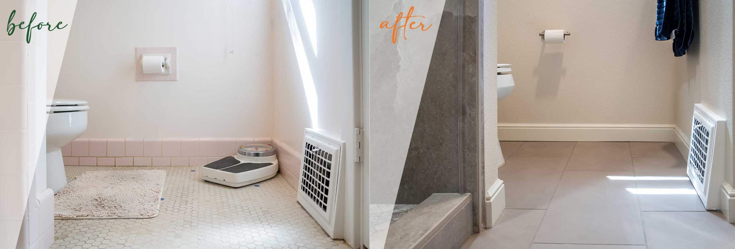 The most dramatic transformation of this project was converting the pink tile tub/shower combo into a spa-like shower which is much more functional for the space. If you’re like us you’ll immediately be drawn to the floor-to-ceiling tile shower surround paired with the trending frameless shower door.