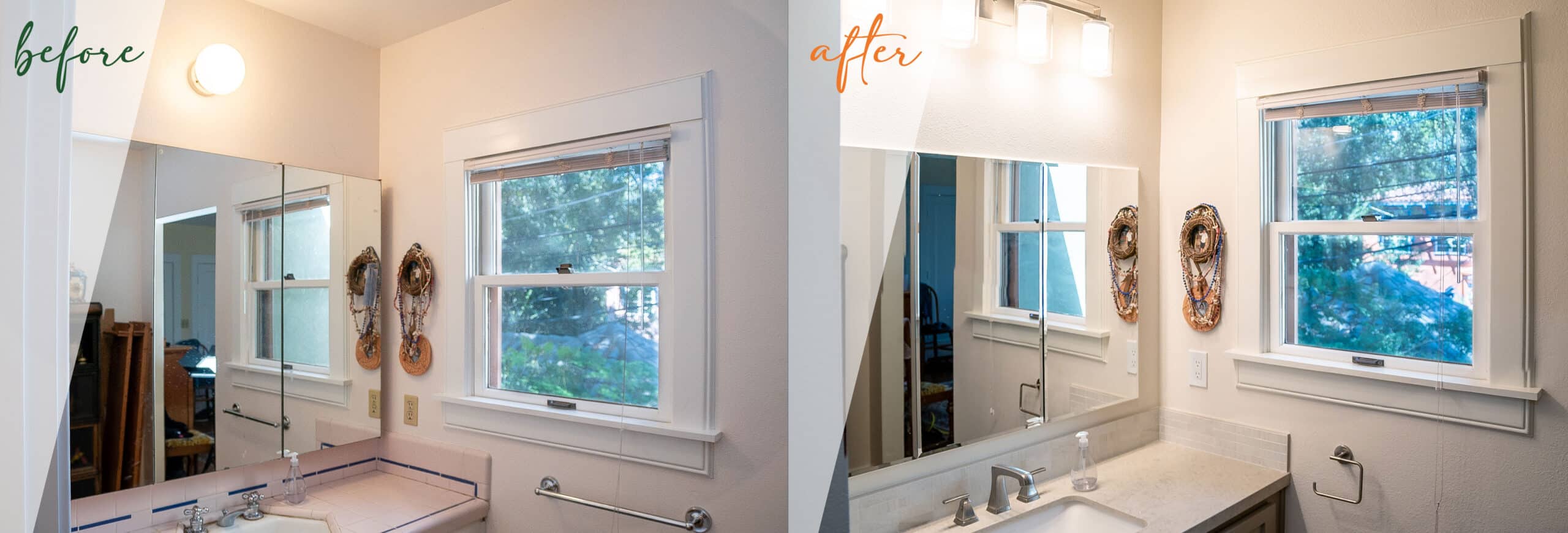 More design highlights include the refinished vanity with new doors + drawers, the mosaic shower floor tile, flooring, and more.