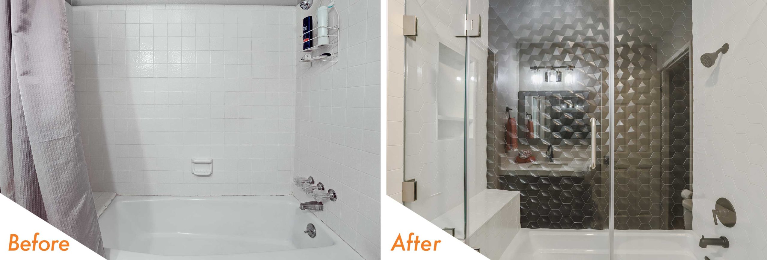 As you can see one of the more dramatic features of the hall remodel is the matte ceramic 3D Tile that creates a unique ambiance. We just love the way the colors and finishes came together on this project, and it certainly was a dramatic difference from its original condition. In the master bathroom, the dramatic floor to ceiling shower tile captures our eye and creates a beautiful focal point!