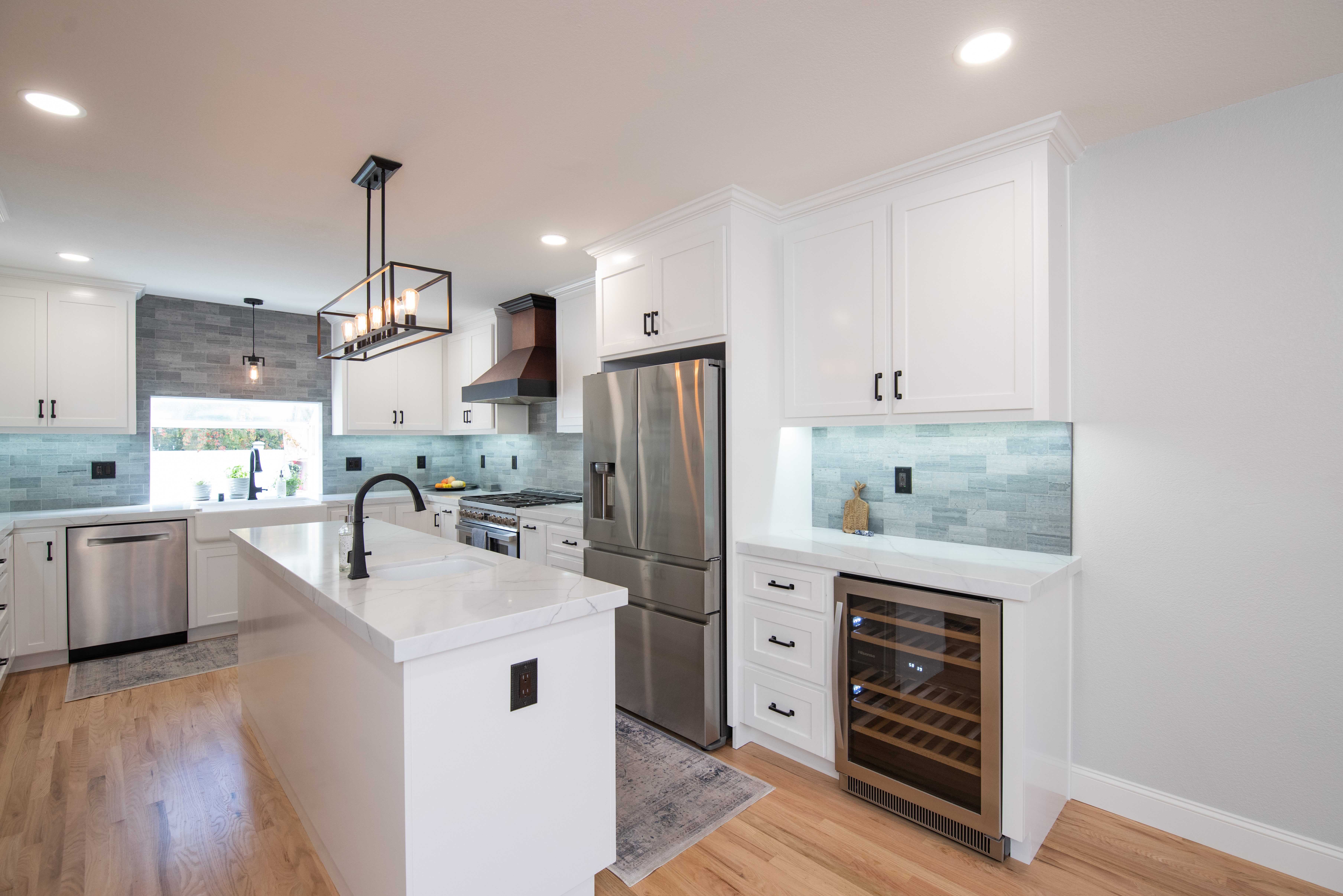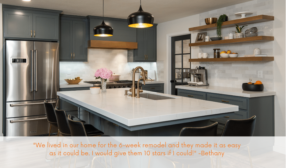 It’s amazing what our team can accomplish in just three short weeks! From the stunning custom cabinets with all the bells + whistles, to the Rivera quartz countertops, to ceramic tile backsplash! Our favorite aspect of this kitchen remodel? It has to be the custom island and wine fridge that is perfect for hosting an amazing dinner!