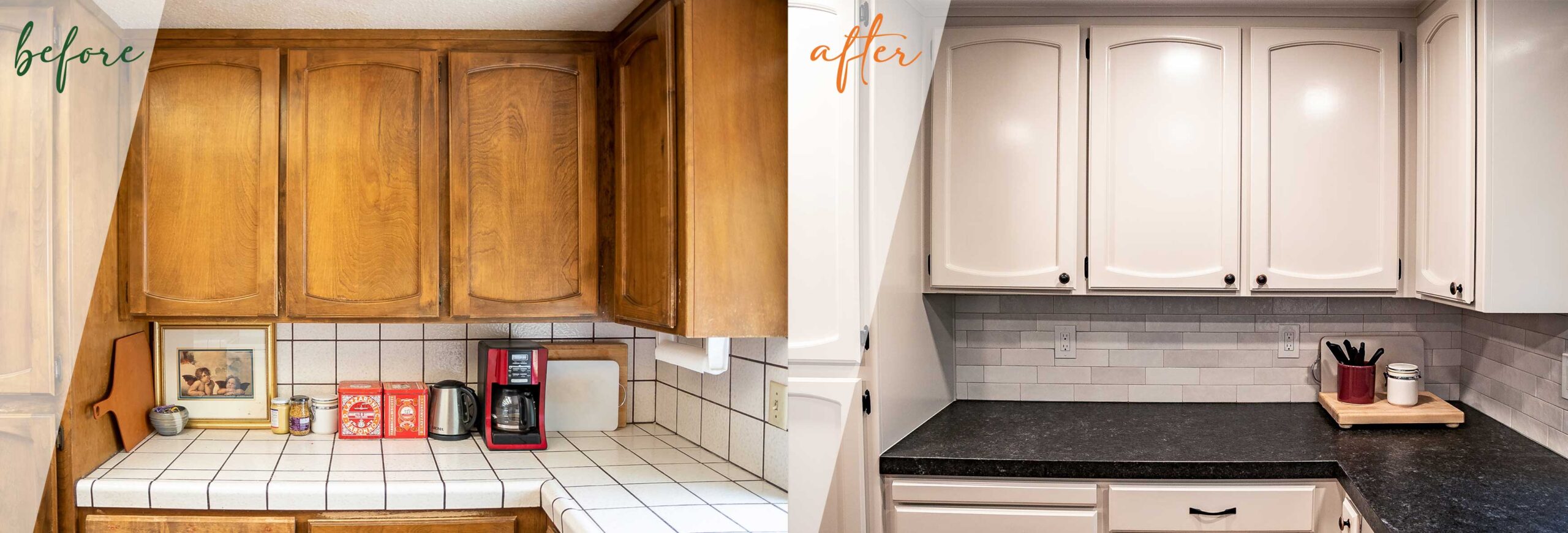 Gone are the dated oak cabinets, worn grouted countertops, and dreary lightbox. In their place, the CRATE team refinished the cabinets, installed new granite countertops, LED can lights, and a fantastic backsplash tile that brings the entire color pallet together.