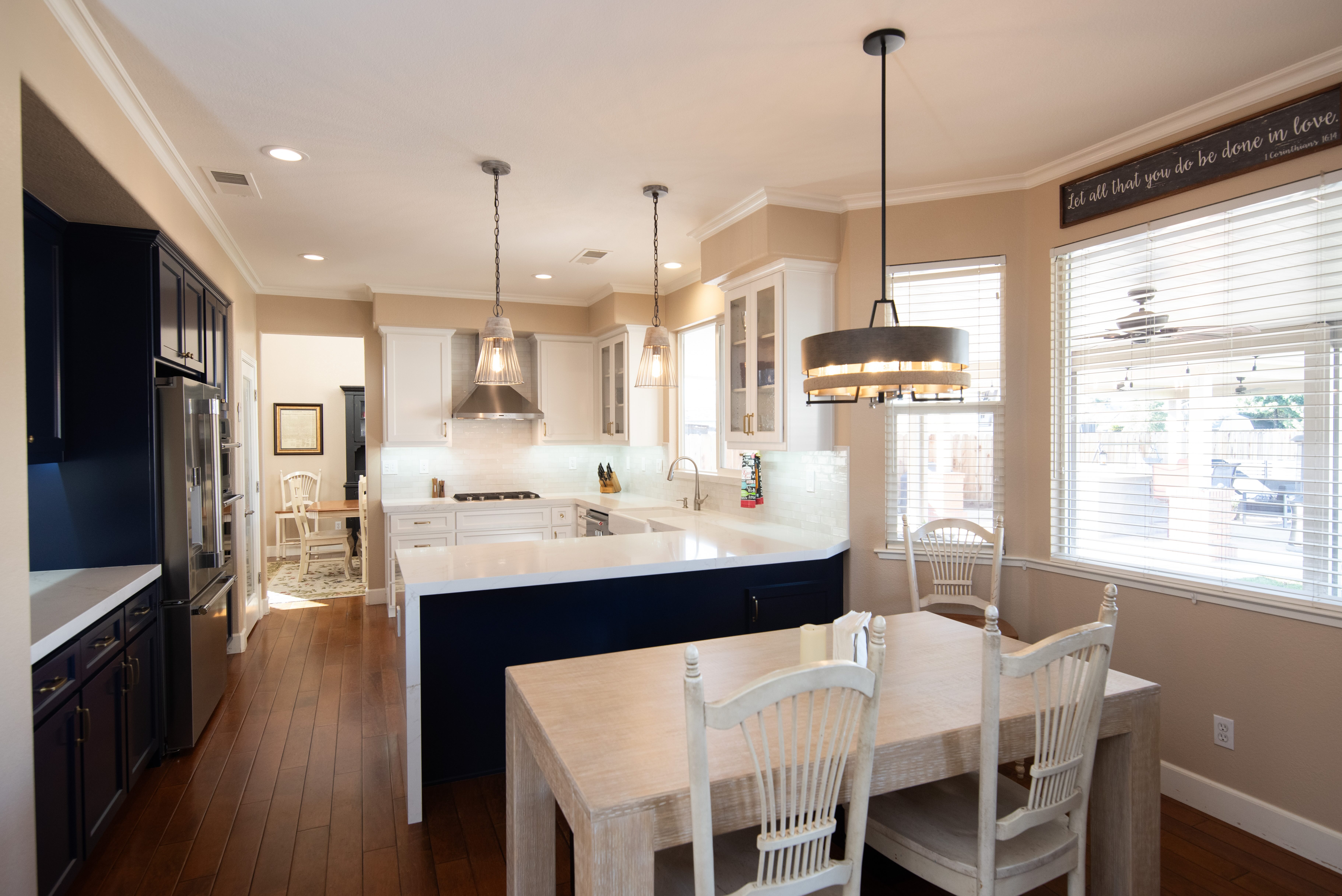 Lighting plays a crucial role in the overall transformation of this Turlock kitchen remodel. CRATE installed: