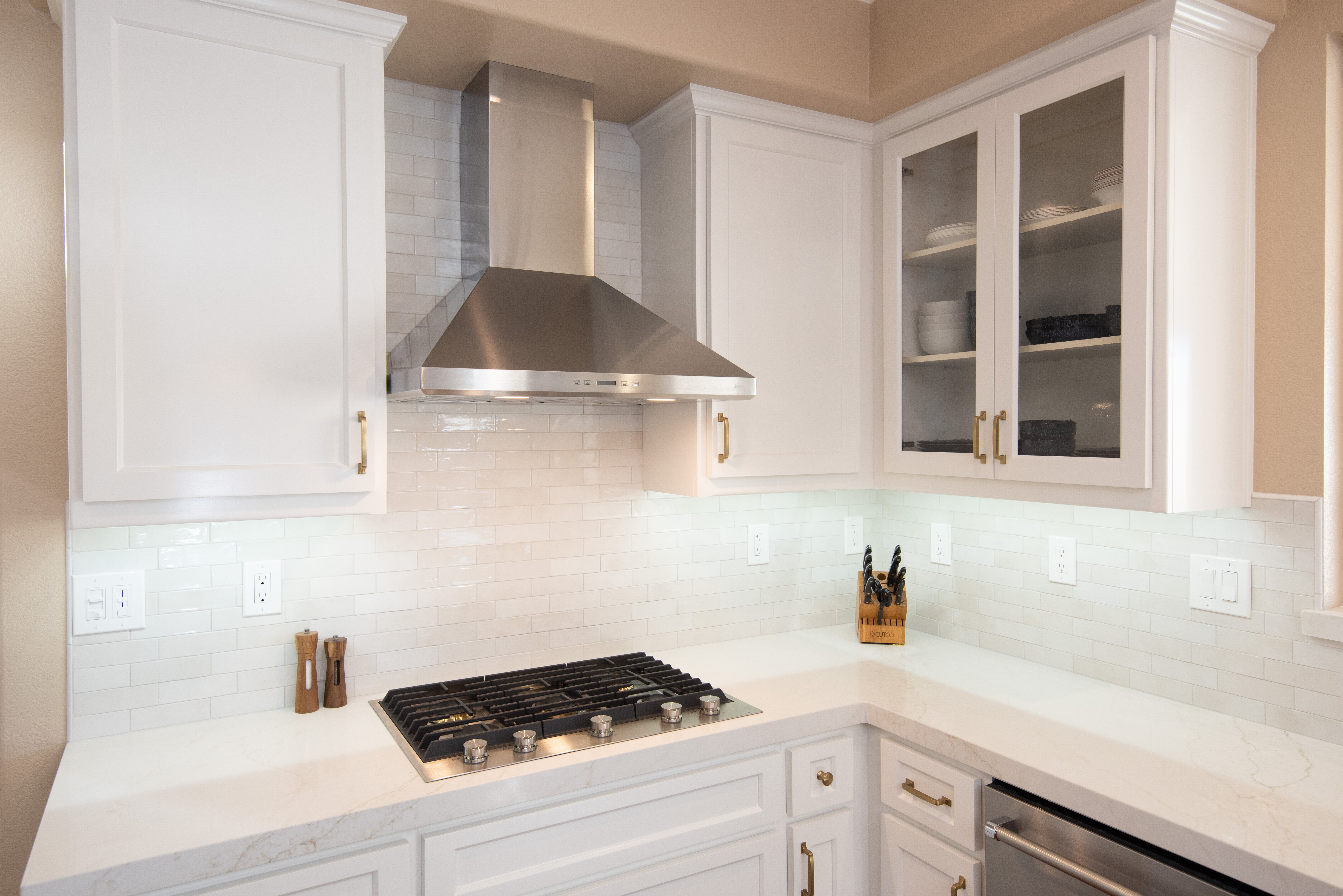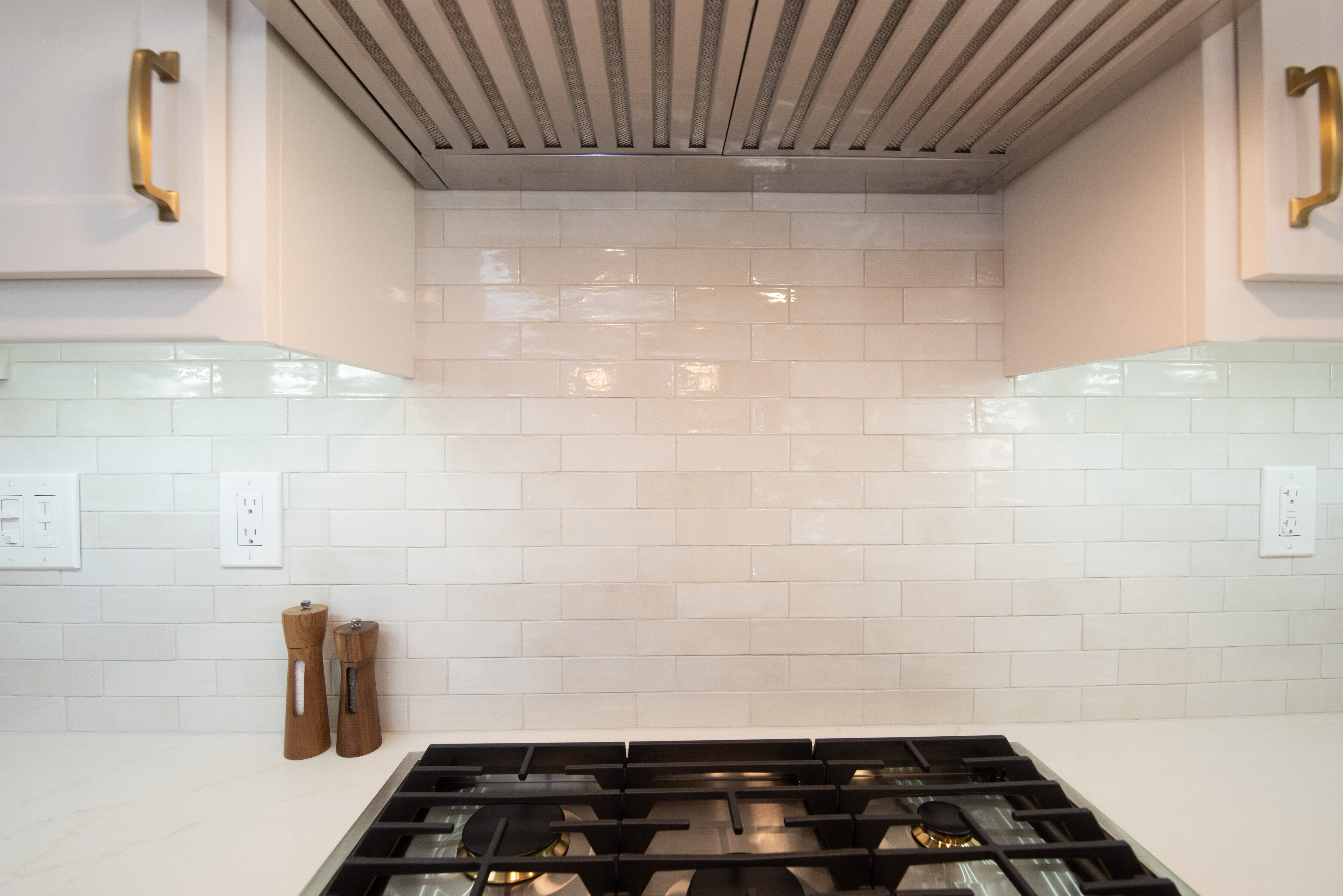The combination of high-gloss white and subtle metallic accents adds depth and reflection, especially where natural light hits the tile. CRATE installed the backsplash horizontally and extended it up to the soffit behind the new chimney-style hood for added visual drama.
