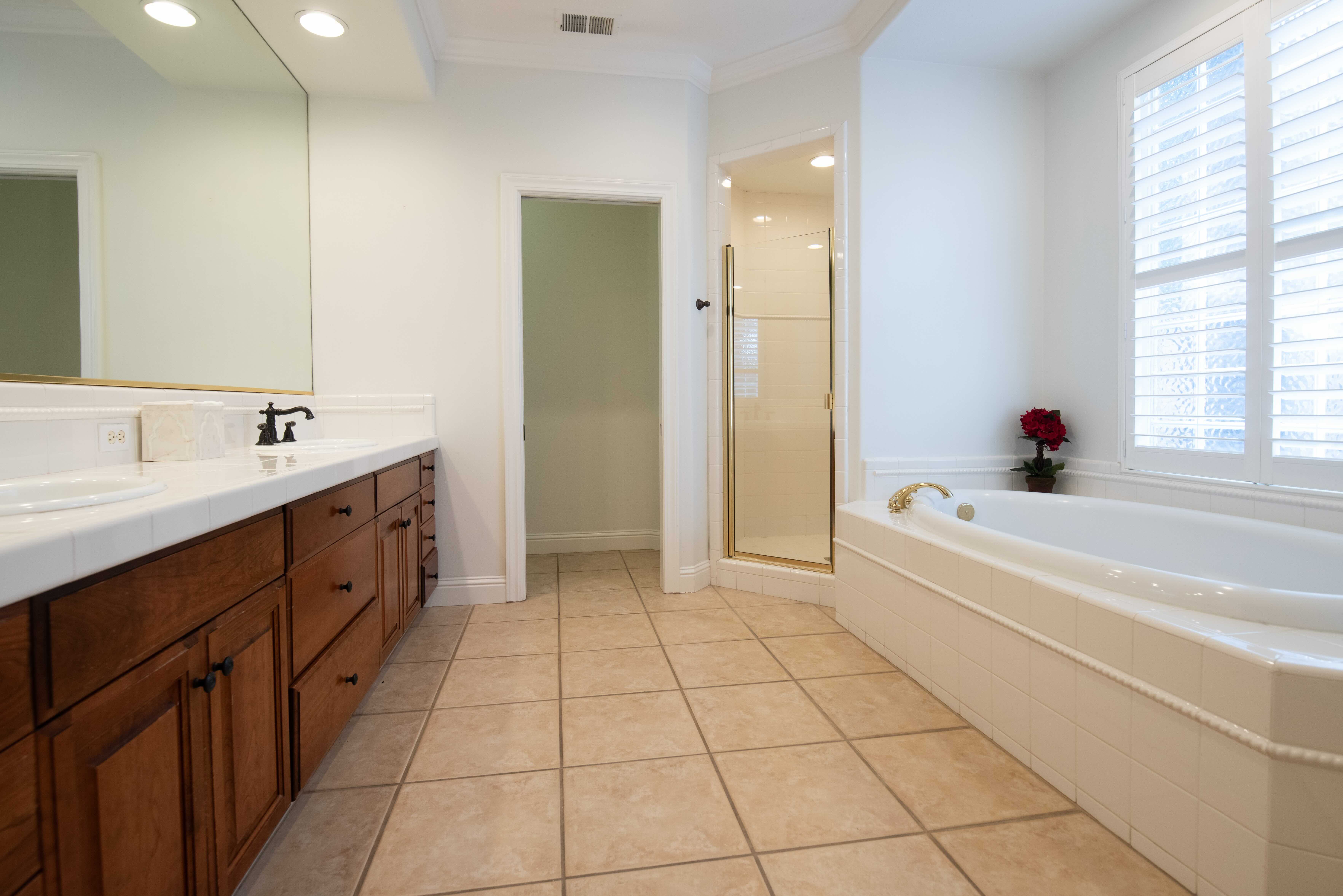 Above the freestanding tub, a statement Millennium Lighting 4214 Pendant in Painted Modern Gold adds a soft, ambient glow. Complementing this are recessed lights in the shower and closet, set at 3000K and 4000K color temperatures respectively, for perfectly balanced illumination throughout the day.