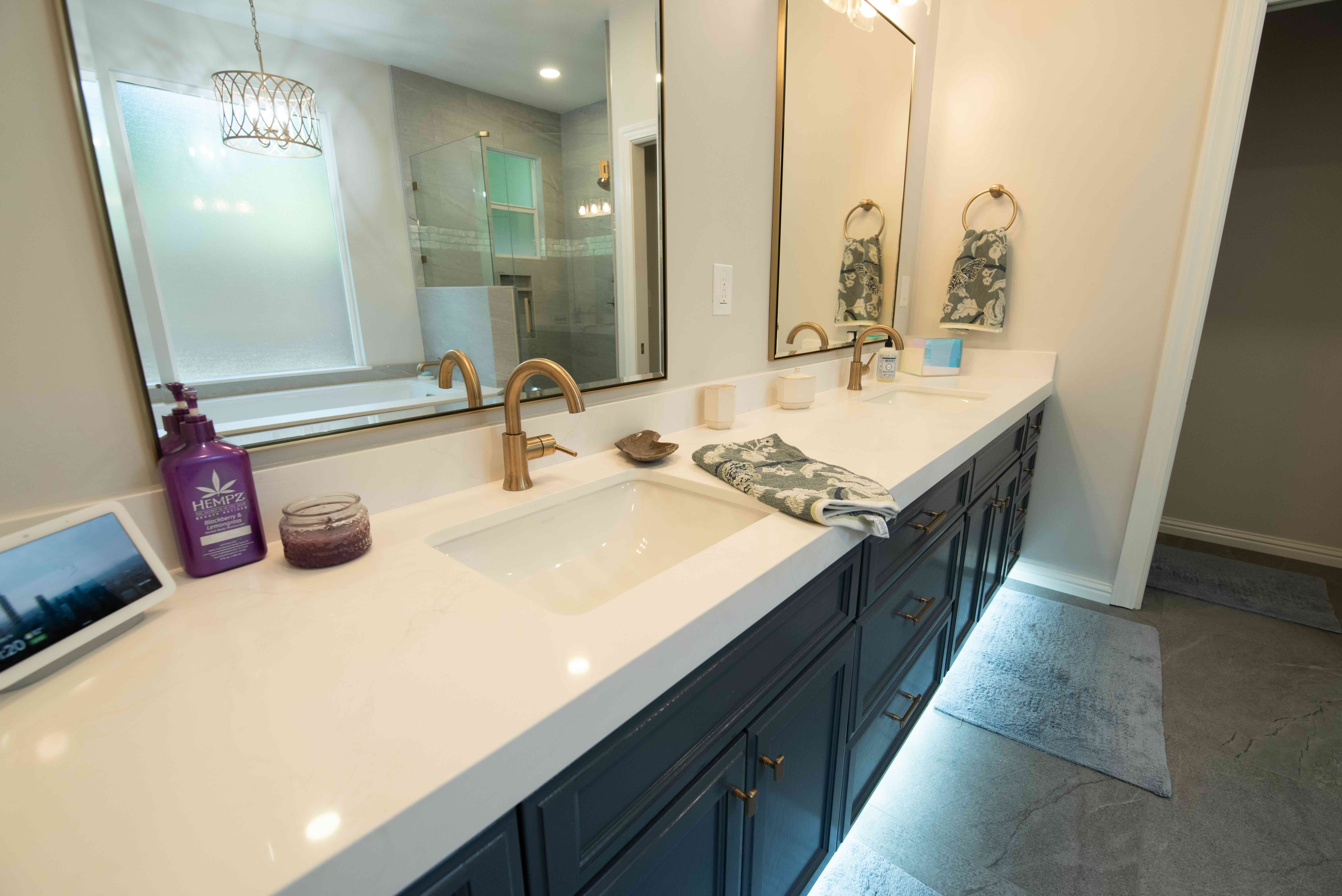 Lighting plays a critical role in setting the mood, and this remodel uses it masterfully. The vanity features two Golden Lighting Aenon 3-Light 22” Vanity Lights in Brushed Champagne Bronze that bring a luxurious, golden warmth to the space.