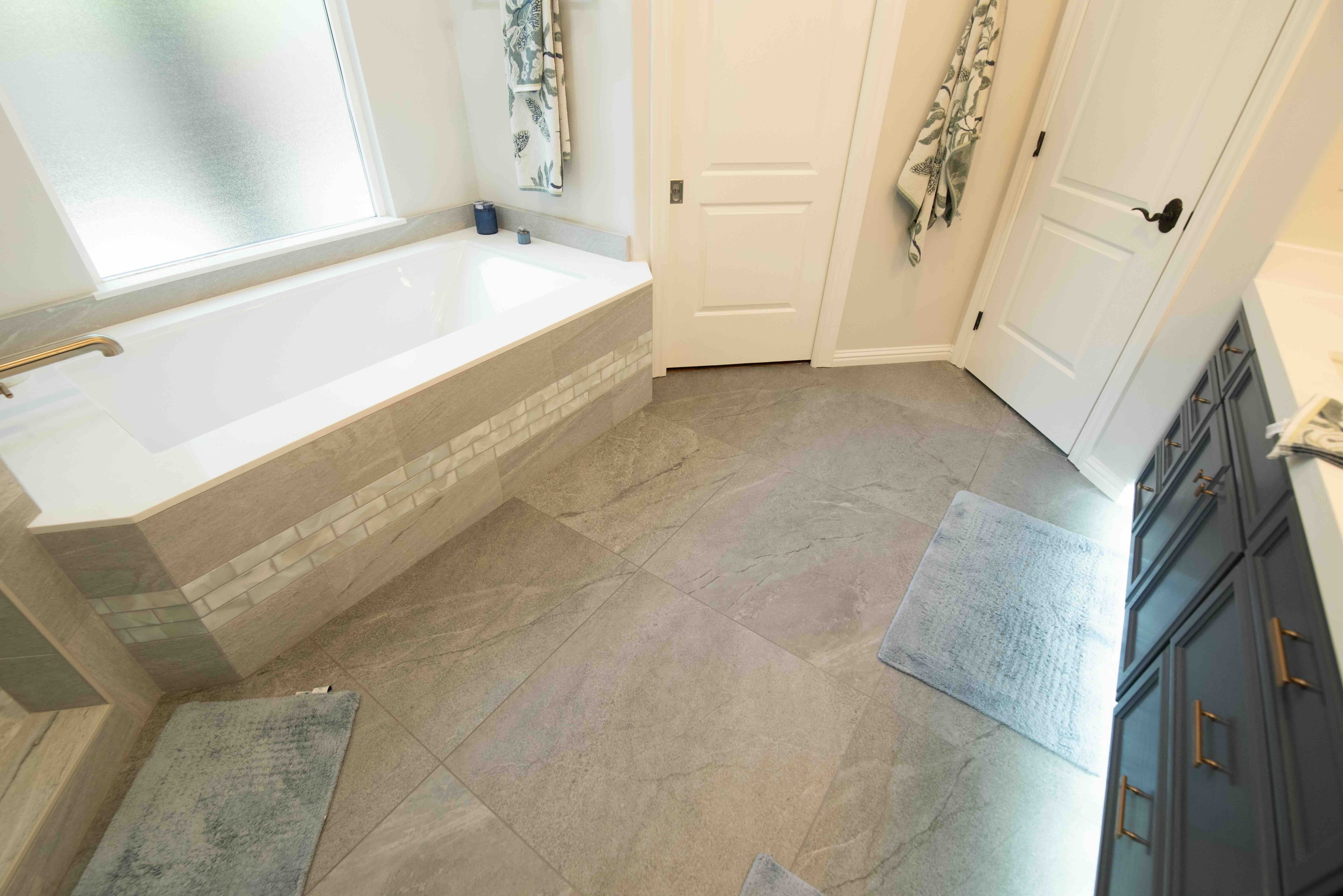 Underfoot, the flooring stuns with Magnifica Savoie Blue 30×30 tile from Bedrosians, grouted in Custom Prism #19 Pewter. The large-format tiles make the space appear more expansive while creating a smooth, modern base that grounds the entire room.