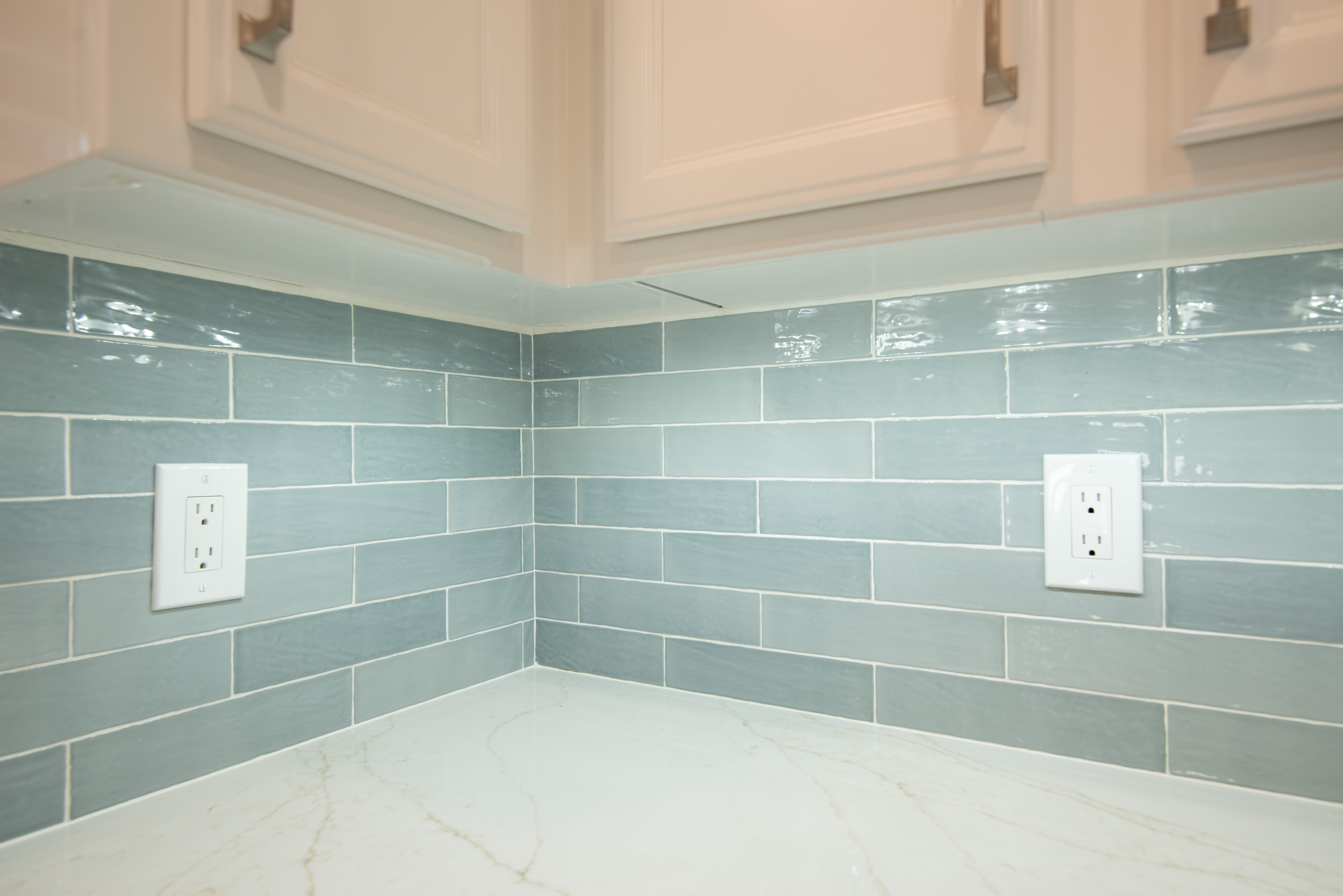 The backsplash, adorned with Marin 2 1/2 x 10 Gloss Misty Blue tiles, adds a pop of color and texture, creating a visually captivating backdrop. The choice of ceramic Jolly edges in a matching hue ensures a cohesive look, beautifully framing the cooking area and enhancing the kitchen’s overall appeal.