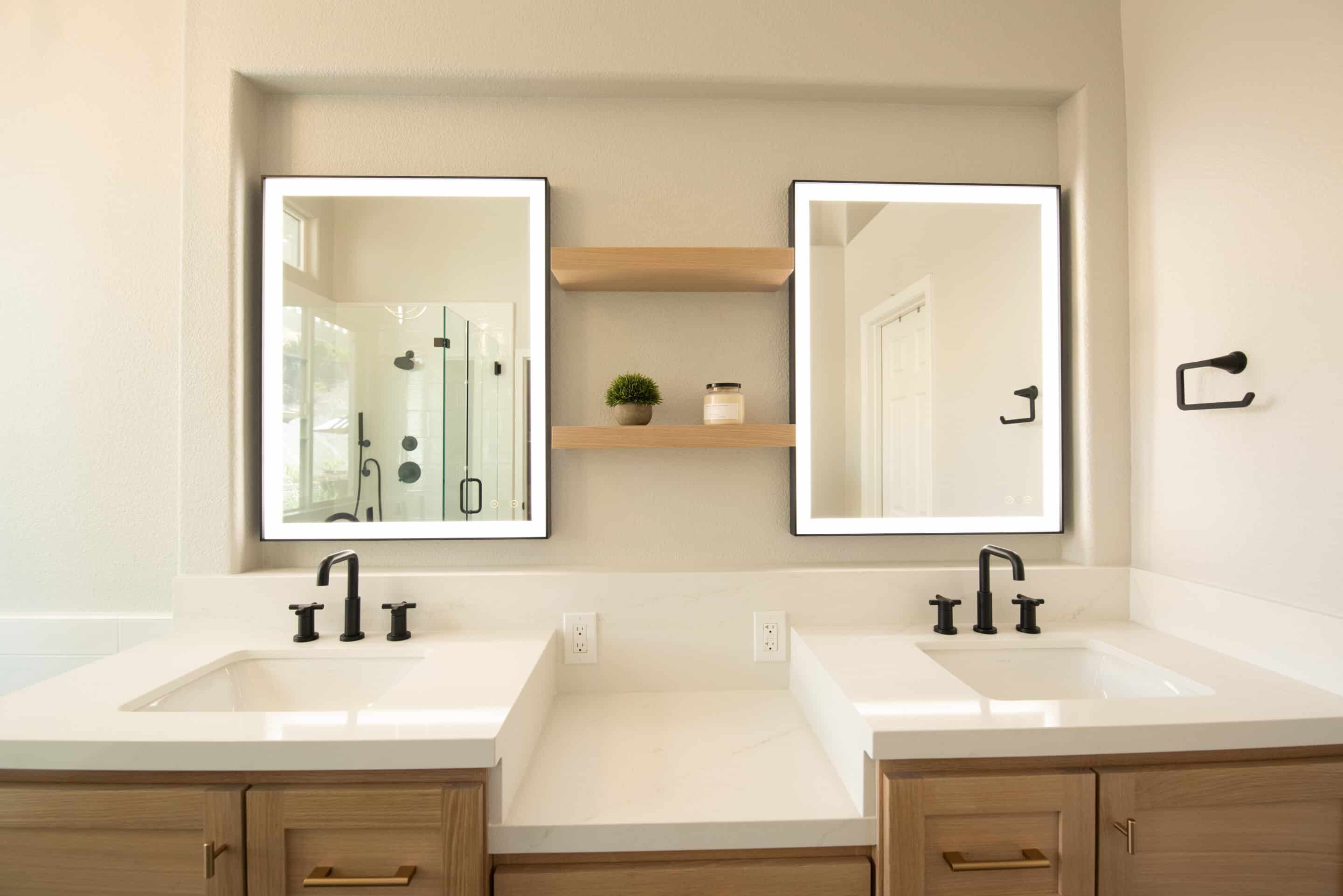 - Floating shelves: Two 22” wide, 8” deep, 2” thick floating shelves were installed between vanity mirrors for additional storage and display.