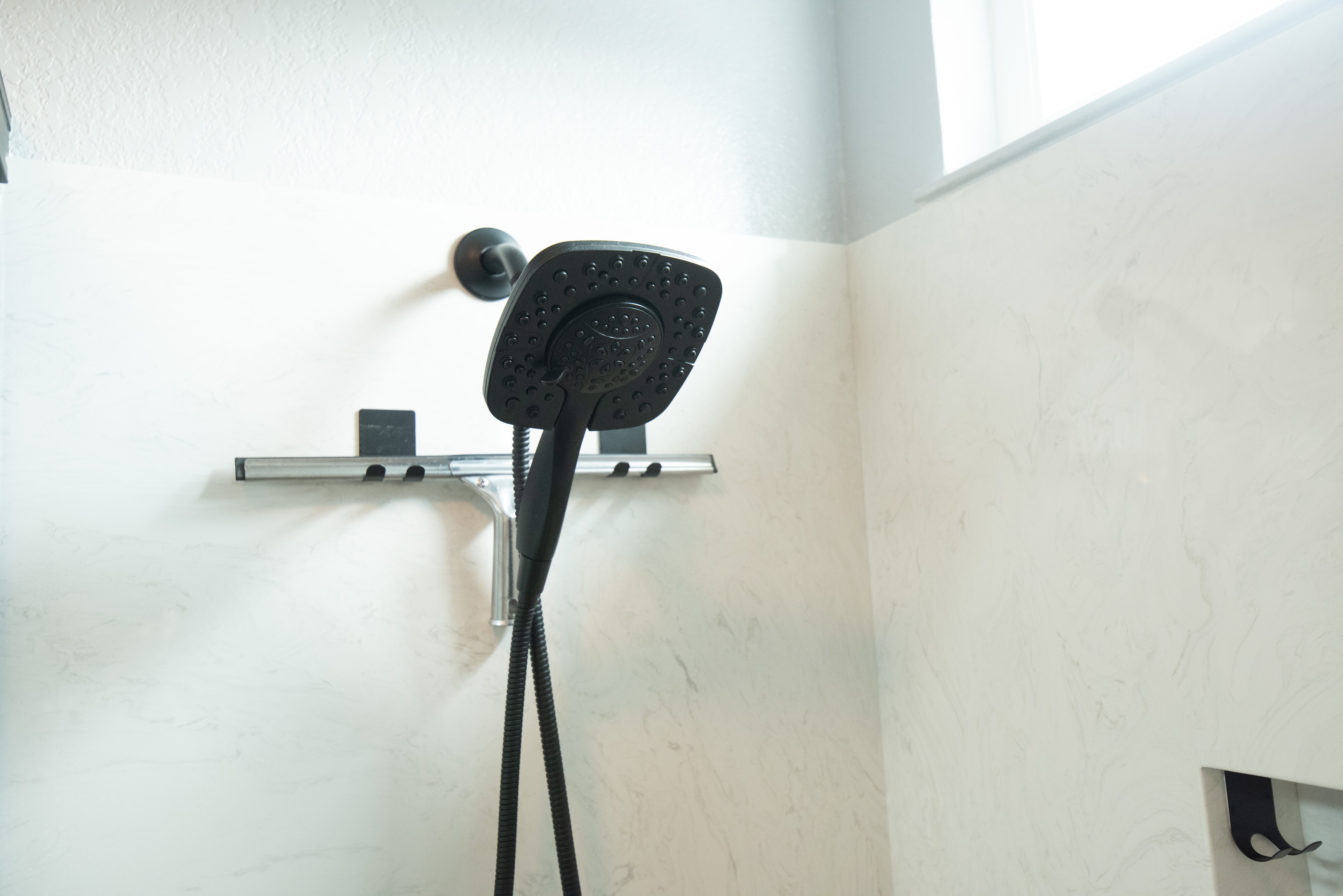 This dual-function fixture provides both a fixed shower head and a hand-held sprayer, combining convenience with designer styling. An additional Delta 24" Traditional Grab Bar in Matte Black was installed under the niche for added safety and support.