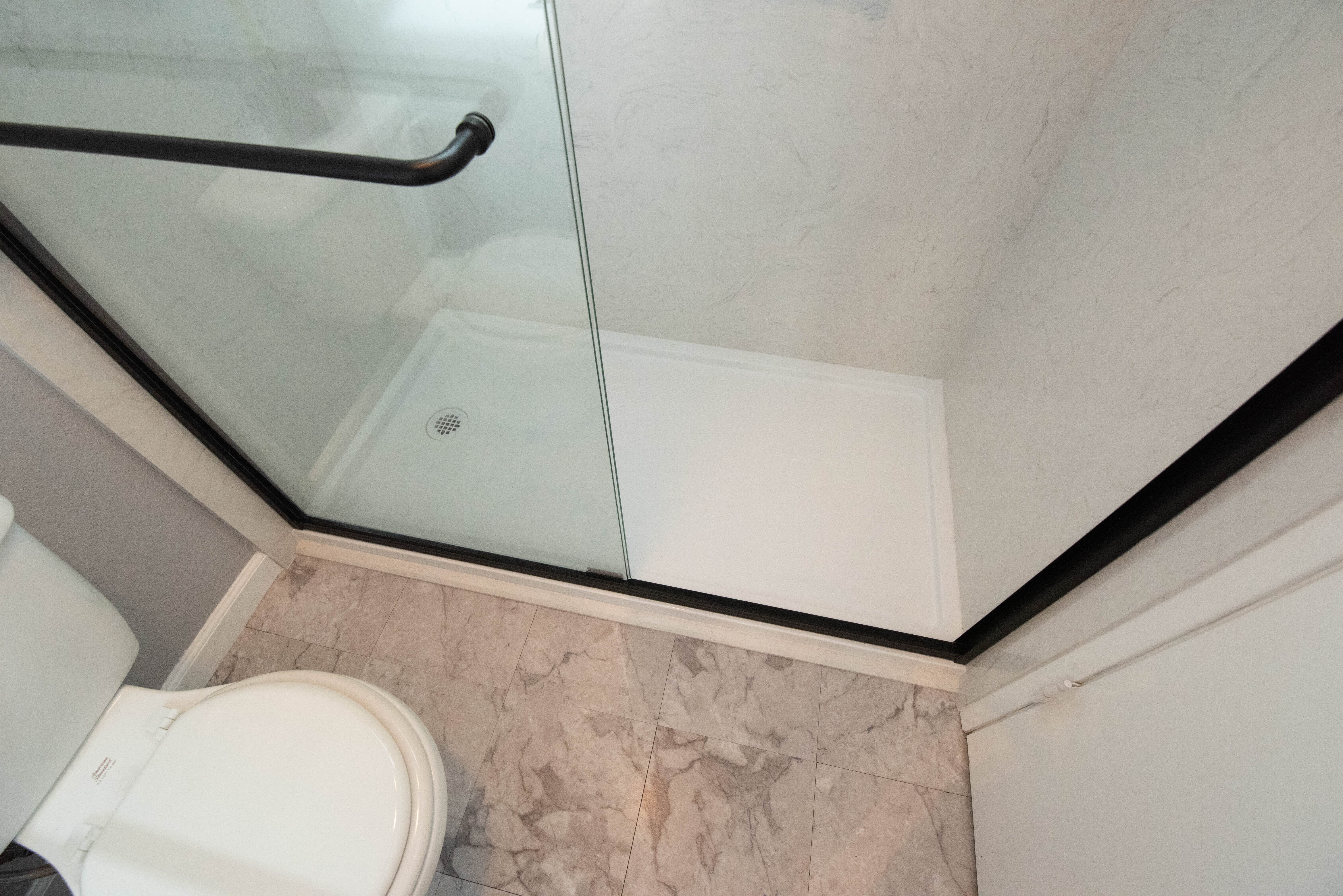 - Flooring adjusted near the shower base to ensure a seamless connection between the existing flooring and new pan