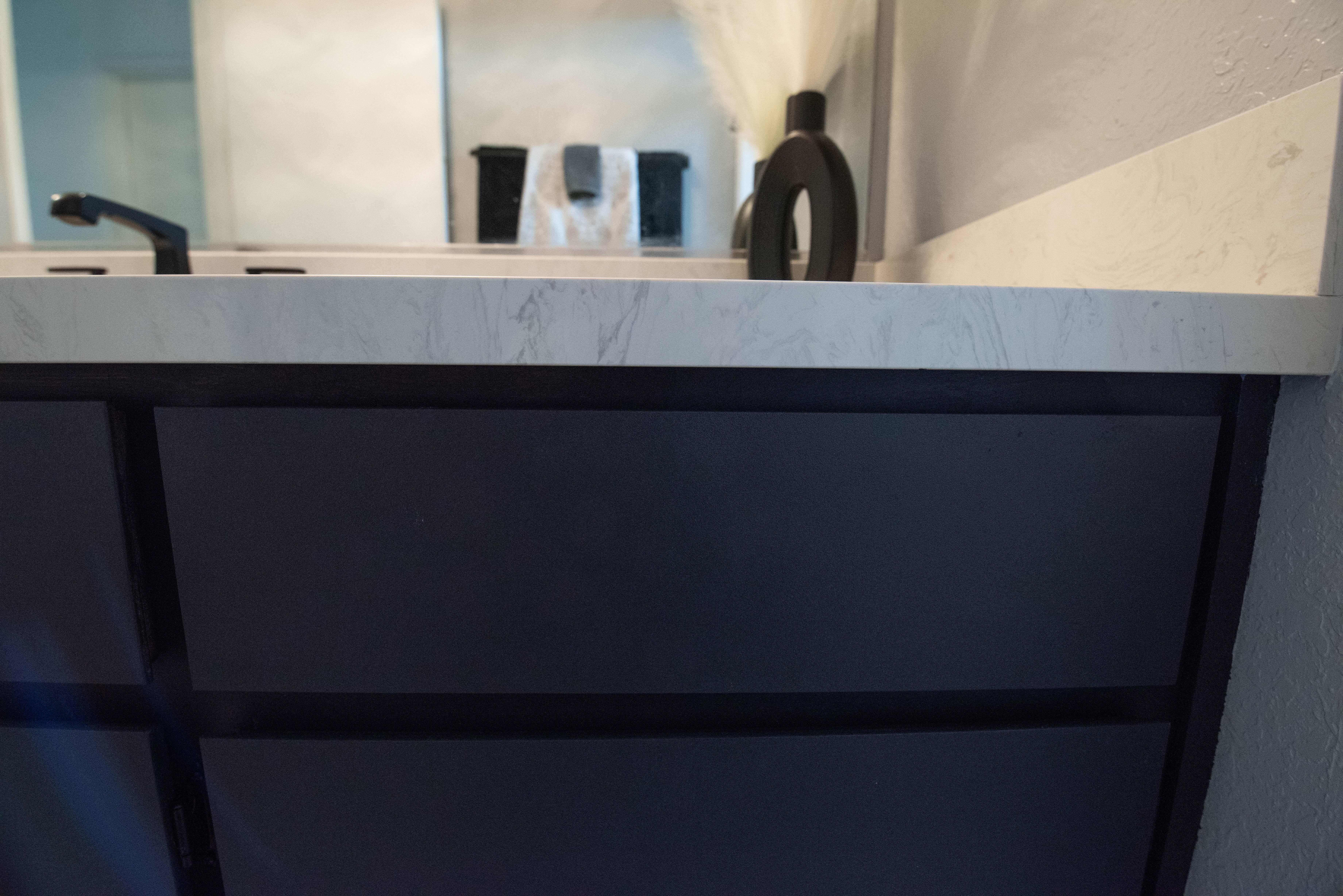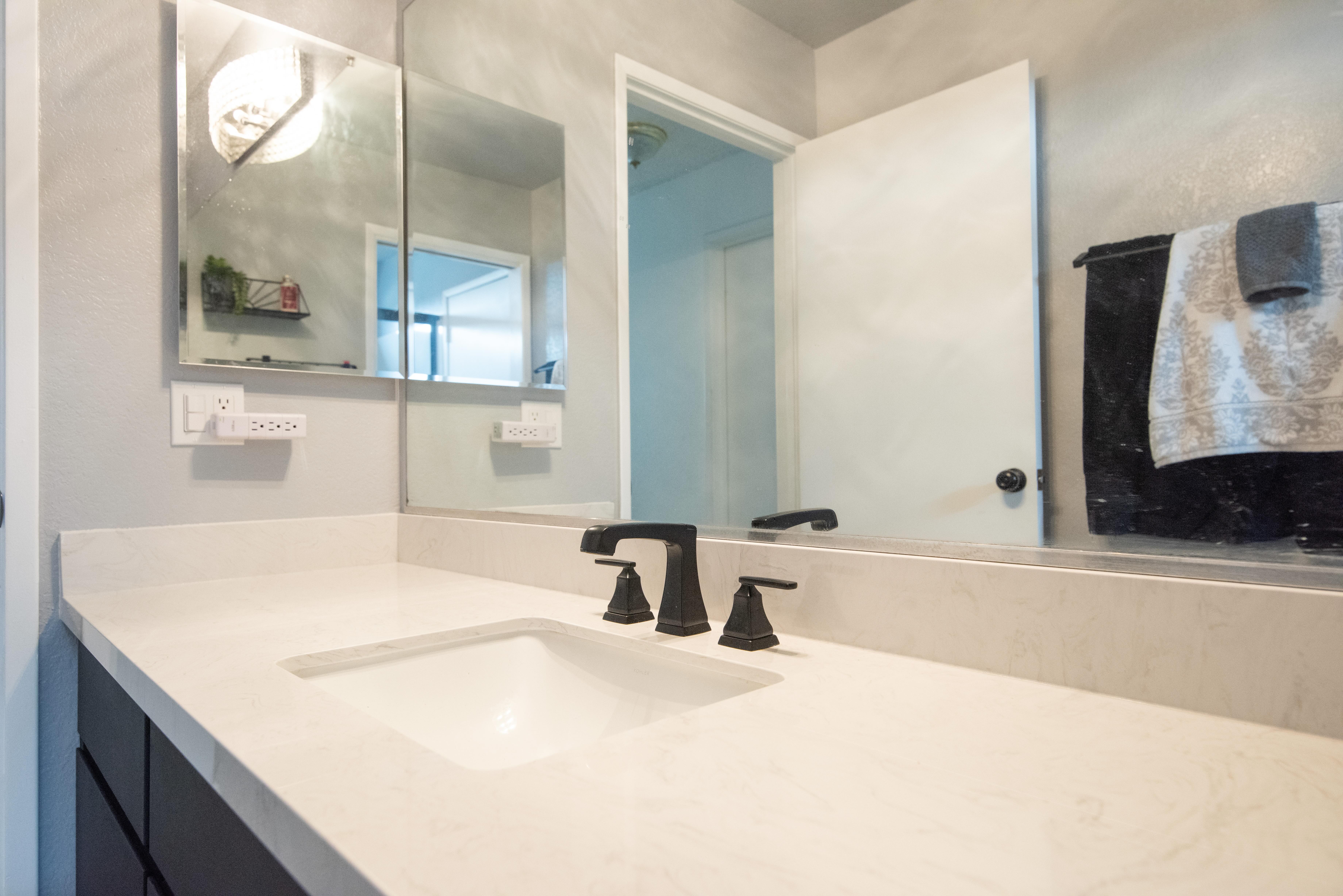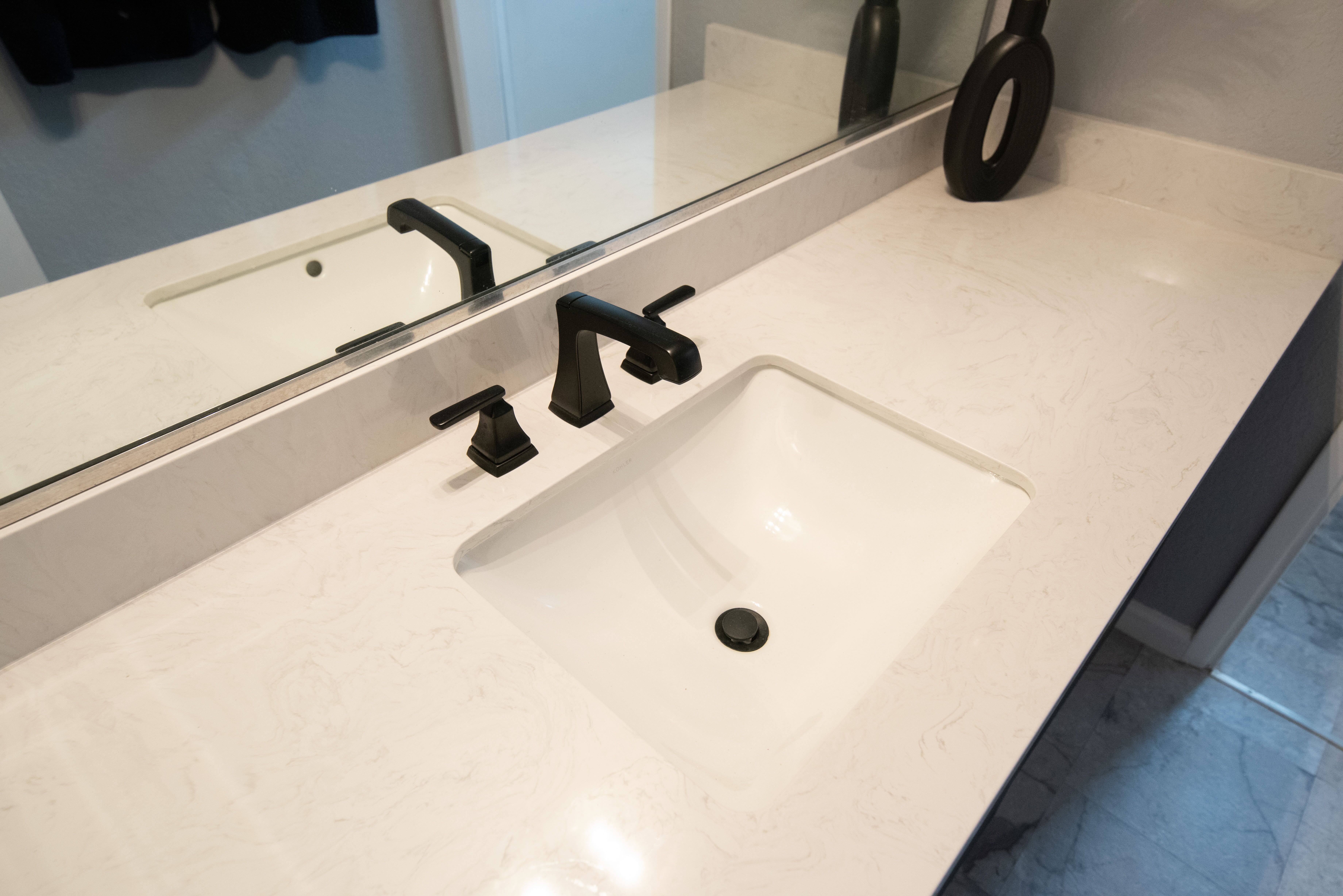 The vanity area also received a major upgrade, giving the homeowners both elegance and durability.