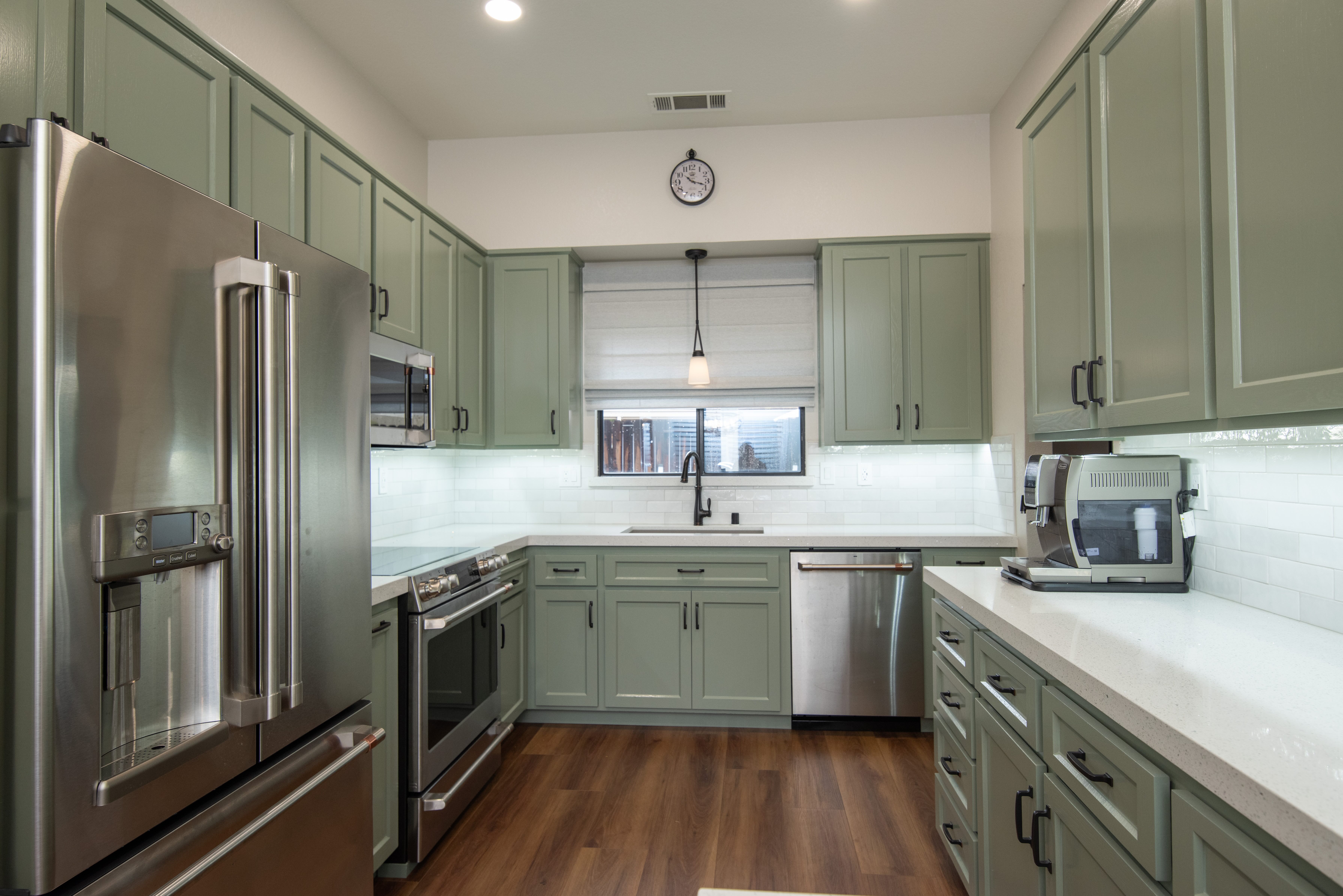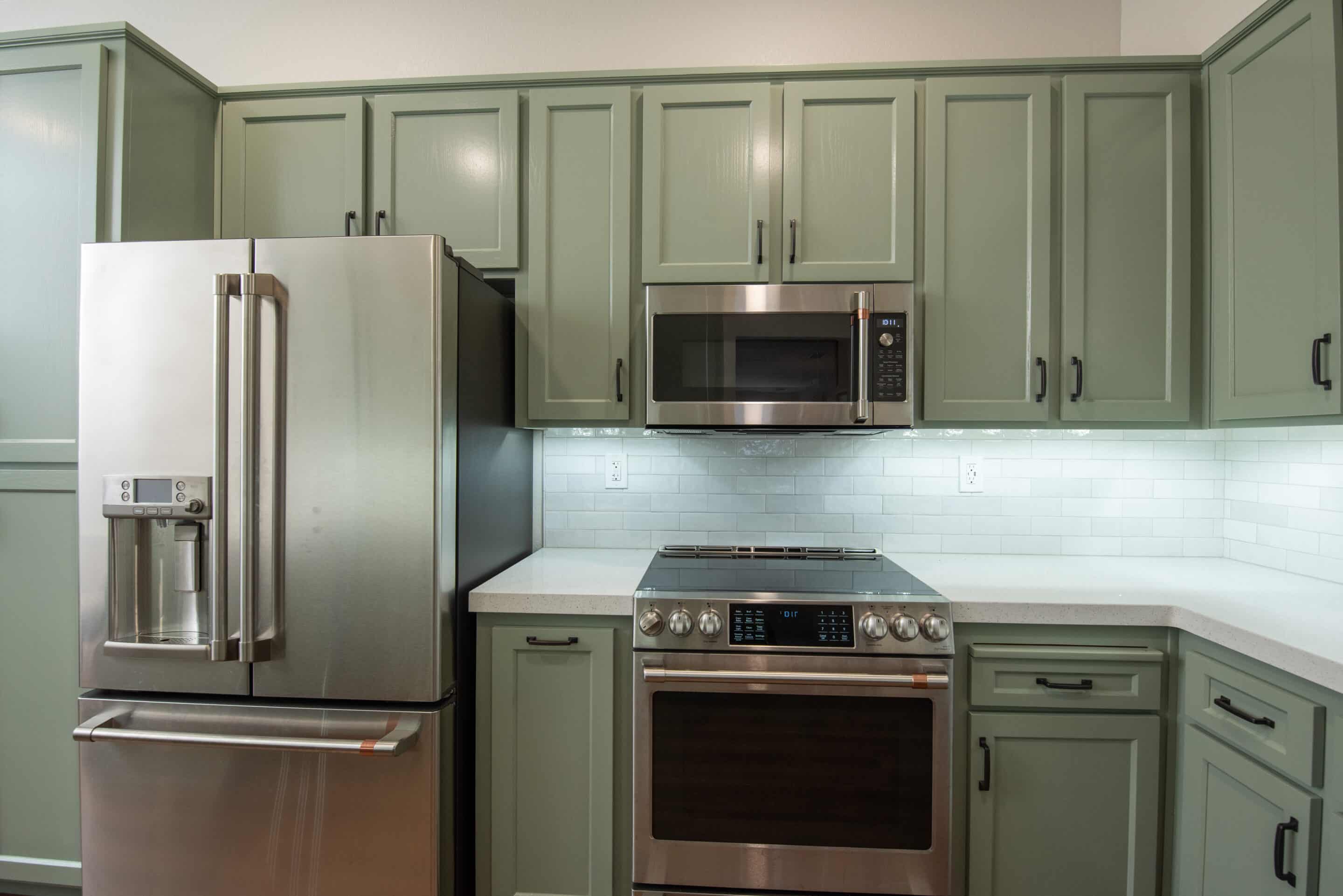 The backsplash, featuring Bedrosians Cloe white tiles, offers a clean and bright backdrop, further illuminated by carefully chosen lighting fixtures. The paint, specifically chosen in shades like SW 9130 Evergreen Fog and SW 7570 Egret White, envelops the kitchen in warmth and modernity, highlighting the remodel’s sleek design.