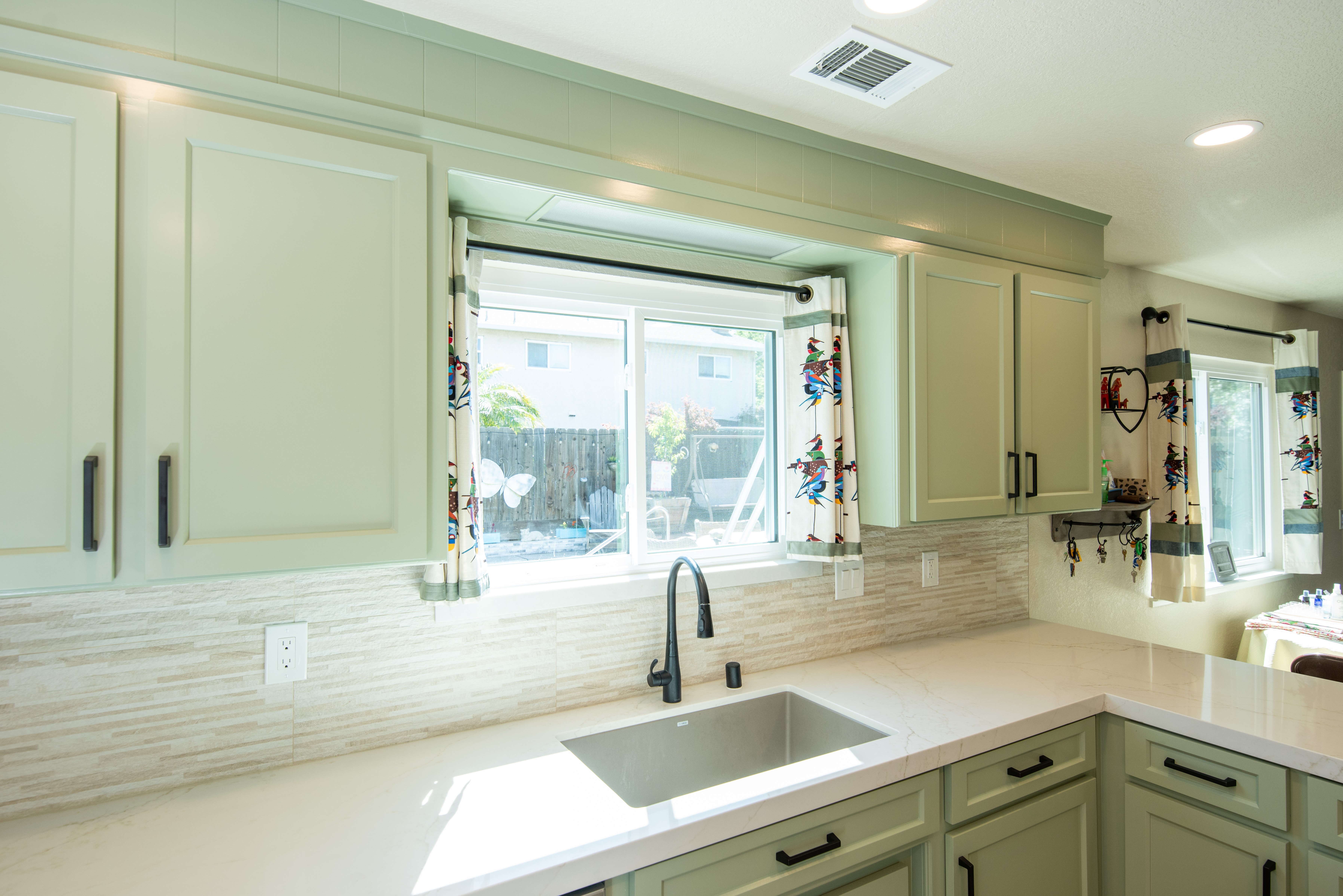 The original kitchen cabinets were not only outdated but also lacked functionality. The remodel introduced custom-built cabinets from Falton Cabinetry in Oakdale, CA, which brought a fresh, modern look to the space. These cabinets were crafted from high-quality red oak, ensuring durability and longevity. The sleek, “euro” soft-close Blum hinges provided a seamless and quiet closing experience, while the ball-bearing drawer glides added a touch of luxury and ease of use.