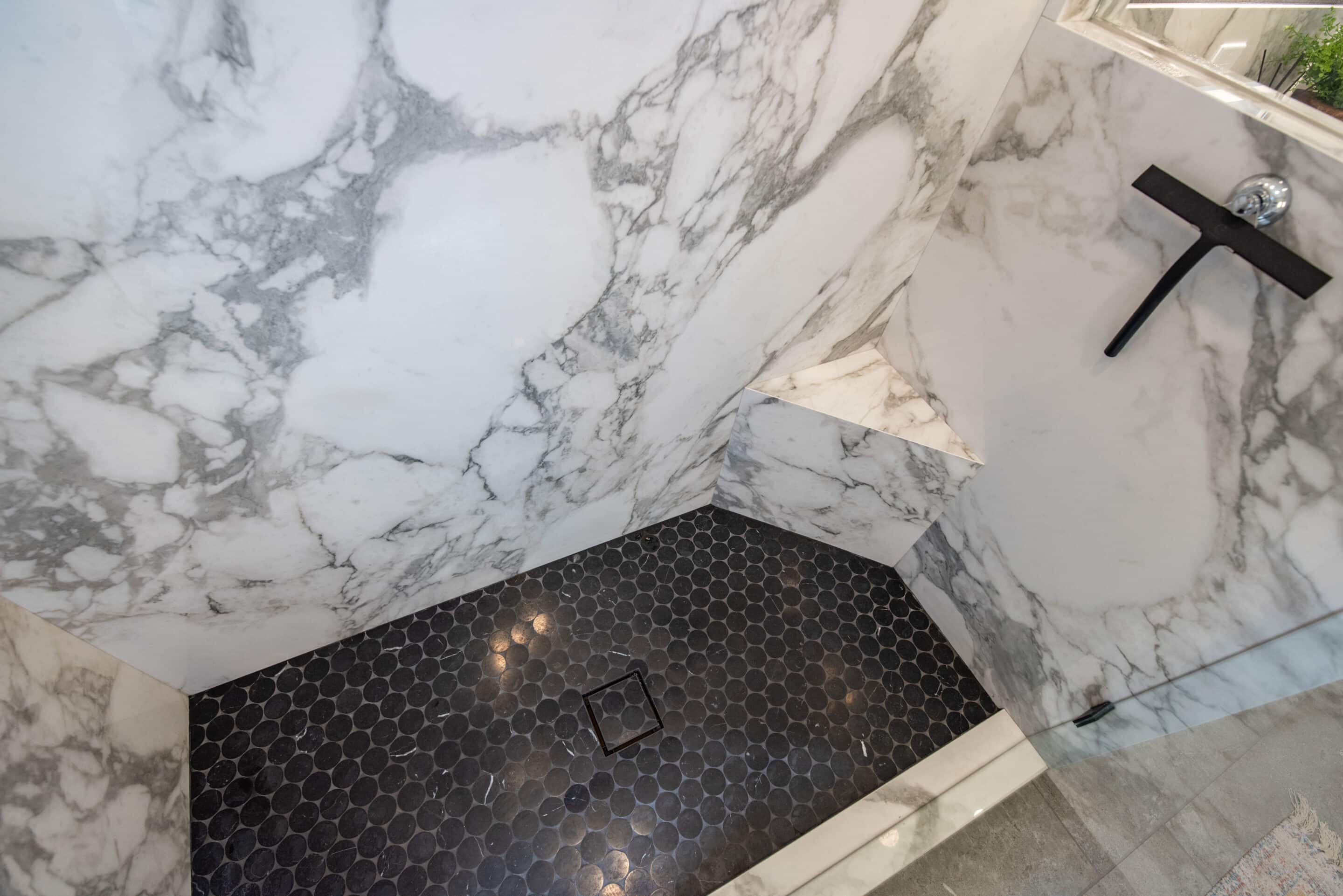 - Vanity Countertop: Arabescato Grey Porcelain with 6″ of slab backsplash