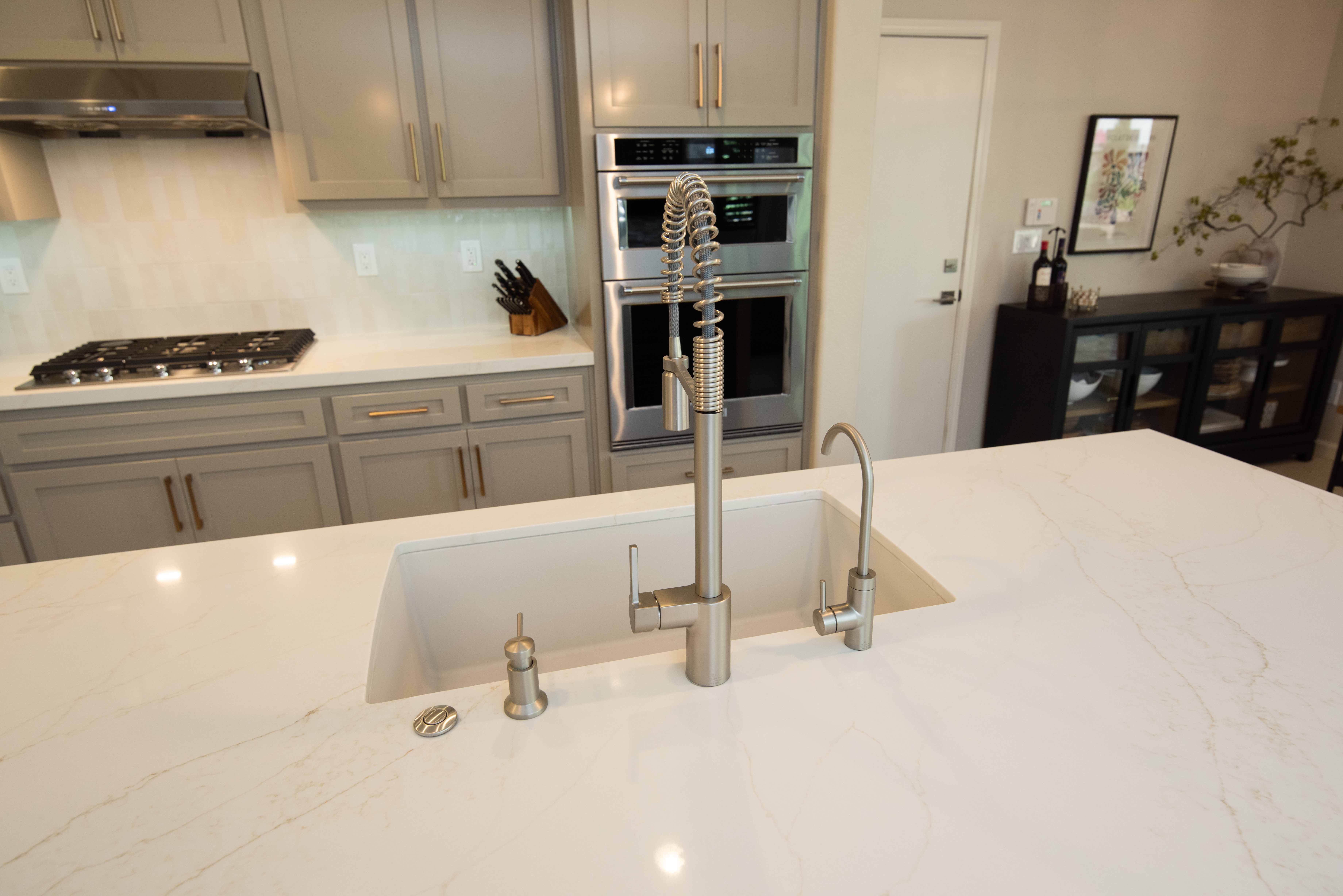 Paired with the sink is a Moen Align High-Arc faucet in spot-resistant stainless, along with a matching Moen soap dispenser. A ½ HP InSinkErator Badger 5 compact garbage disposal was installed with an air switch positioned to the right of the sink, ensuring convenience without cluttering the countertop.